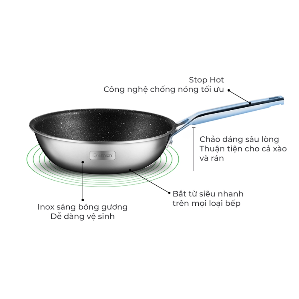 Phần cán chảo sử dụng công nghệ "Stop Hot" chống nóng hiện đại giúp quai cán hạn chế bị nóng lên gây mất an toàn cho người sử dụng.